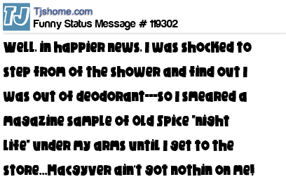 X Well, in happier news, I was shocked to step from of the shower and find out I was out of deodorant---so I smeared a magazine sample of Old Spice "night life" under my arms until I get to the store...Macgyver ain't got nothin on me!