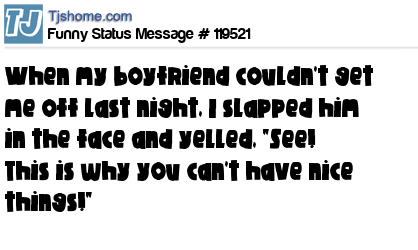 X says When my boyfriend couldn't get me off last night, I slapped him in the face and yelled, "See! This is why you can't have nice things!"