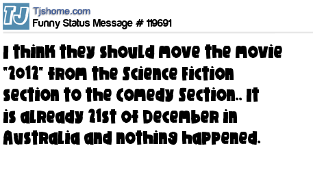 X says I think they should move the movie "2012" from the Science Fiction section to the Comedy Section.. It is already 21st of December in Australia and nothing happened.