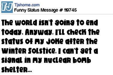 X The world isn't going to end today. Anyway, I'll check the status of my joke after the Winter Solstice, I can't get a signal in my nuclear bomb shelter...
