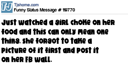 X says Just watched a girl choke on her food and this can only mean one thing, she forgot to take a picture of it first and post it on her FB wall.