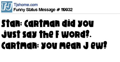 X Stan: Cartman did you just say the F word?. Cartman: you mean J ew?