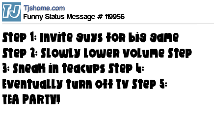 X says Step 1: Invite guys for big game Step 2: Slowly lower volume Step 3: Sneak in teacups Step 4: Eventually turn off TV Step 5: TEA PARTY!