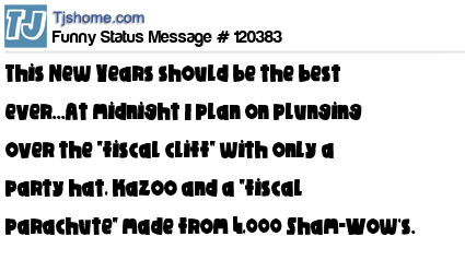 X This New Years should be the best ever...At midnight I plan on plunging over the "fiscal cliff" with only a party hat, kazoo and a "fiscal parachute" made from 4,000 Sham-Wow's. ツ