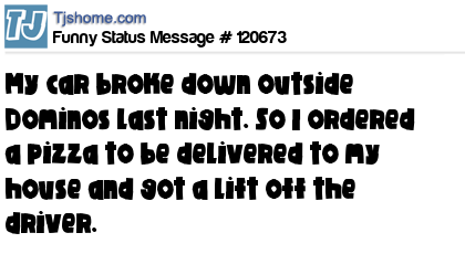 - # 130432 My car broke down outside Pizza Hut last night. So I ordered a pizza to be delivered to my house and got a lift from the driver.