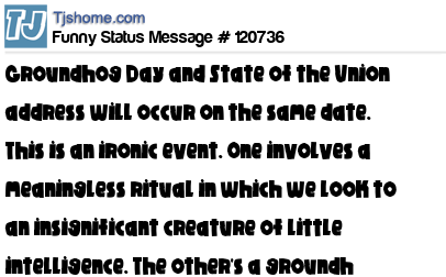 X Groundhog Day and State of the Union address will occur on the same date. This is an ironic event. One involves a meaningless ritual in which we look to an insignificant creature of little intelligence. The other's a groundh