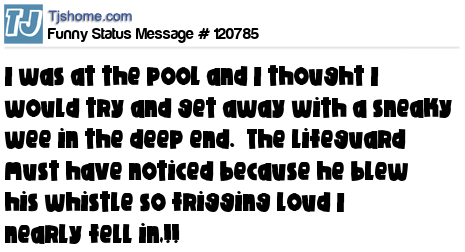 - # 151790 I was at the pool today and tried to sneak a quick pee in the deep end. The lifeguard must have seen me. He blew his whistle so loud that I almost fell in.