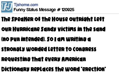 X The Speaker of the House outright left our Hurricane Sandy victims in the sand (no pun intended). So I am writing a strongly worded letter to Congress requesting that every American Dictionary replaces the word "erection" with "Boehner"....