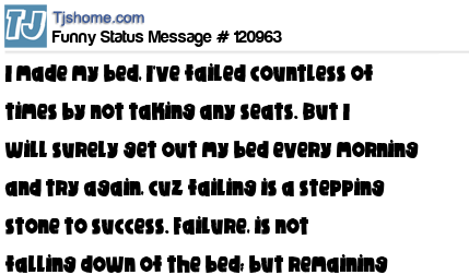 X I made my bed, I've failed countless of times by not taking any seats. But I will surely get out my bed every morning and try again, cuz failing is a stepping stone to success. Failure, is not falling down of the bed; but remaining where you have fallen.