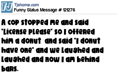 X says A cop stopped me and said "License please" so I offered him a donut and said "I donut have one" and we laughed and laughed and now I am behind bars.