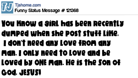 X says You know a girl has been recently dumped when she post stuff like, “I don't need any love from any man. I only need to love and be loved by ONE man. He is the Son of God, JESUS!”