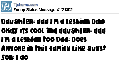 - # 83823 Daughter: Dad I'm a lesbian Dad: ok it's cool 2nd daughter: I'm also a lesbian Dad: Does anyone in this family like *%#k? Son: I do!
