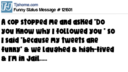 - # 182850 A cop stopped me and asked "Do you know why I followed you" so I said "because my tweets are funny" We laughed and high-fived & now I'm in Jail