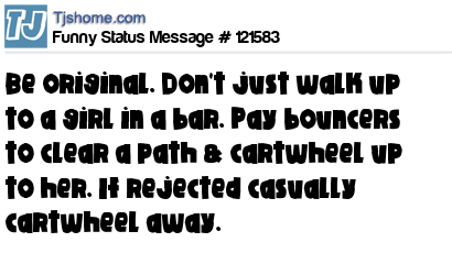 X Be original. Don't just walk up to a girl in a bar. Pay bouncers to clear a path & cartwheel up to her. If rejected casually cartwheel away.