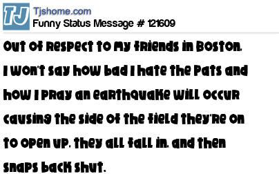 X  Out of respect to my friends in Boston, I won't say how bad I hate the Pats and how I pray an earthquake will occur causing the side of the field they're on to open up, they all fall in, and then snaps back shut.