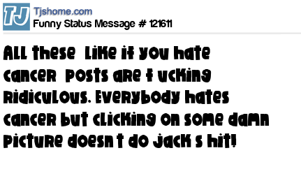 X says All these “like if you hate cancer” posts are f ucking ridiculous. Everybody hates cancer but clicking on some damn picture doesn’t do jack s hit!