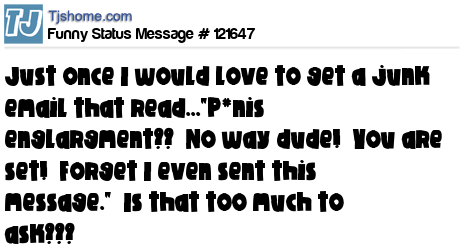 X Just once I would love to get a junk email that read..."P*nis englargment?? No way dude! You are set! Forget I even sent this message." Is that too much to ask???