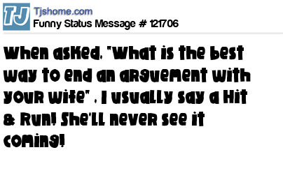 X When asked, "What is the best way to end an arguement with your wife" , I usually say a Hit & Run! She'll never see it coming!