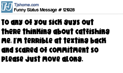 X says To any of you sick guys out there thinking about catfishing me, I'm terrible at texting back and scared of commitment so please just move along.