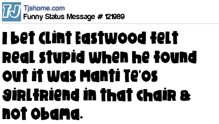 X is I bet Clint Eastwood felt real stupid when he found out it was Manti Te'os girlfriend in that chair & not Obama.
