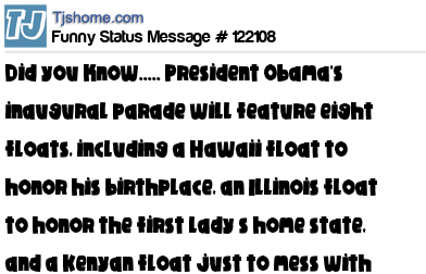X Did you know..... President Obama's inaugural parade will feature eight floats, including a Hawaii float to honor his birthplace, an Illinois float to honor the first lady’s home state, and a Kenyan float just to mess with Republicans