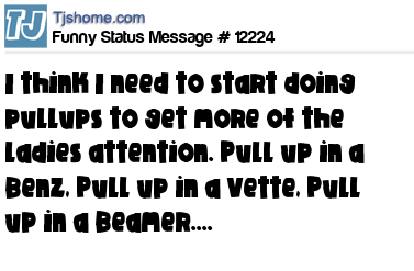 X I think I need to start doing pullups to get more of the ladies attention. Pull up in a Benz, Pull up in a Vette, Pull up in a Beamer....