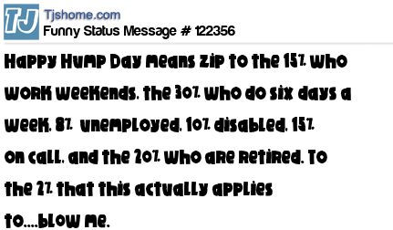 X Happy Hump Day means zip to the 15% who work weekends, the 30% who do six days a week, 8% unemployed, 10% disabled, 15% on call, and the 20% who are retired. To the 2% that this actually applies to....bl0w me.