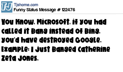 X says You know, Microsoft, if you had called it Bang instead of Bing, you'd have destroyed Google. Example: I just Banged Catherine Zeta Jones.