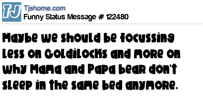 - # 125229 Maybe we should be focusing less on Goldilocks and more on why Mama and Papa bear don't sleep in the same bed anymore.
