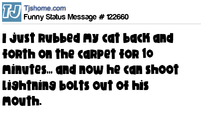- # 122689 I rubbed my cats back and forth on the carpet for ten minutes, now they can shoot lightning out of their eyes, They're running around playing laser tag.