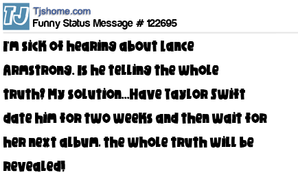 X is I'm sick of hearing about Lance Armstrong. Is he telling the whole truth? My solution...Have Taylor Swift date him for two weeks and then wait for her next album, the whole truth will be revealed!