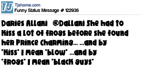 X says Daries Allani @Dallani She had to kiss a lot of frogs before she found her Prince Charming... ...and by "kiss" I mean "blow" ...and by "frogs" I mean "black guys"