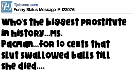 - # 17672 who is the biggest prostitute alive? Mrs. pacman , because for 25 cents that bi*ch will swallow balls until she dies!