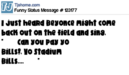 X I just heard Beyonce might come back out on the field and sing, "♫♪♫ Can you pay yo Bills?, Yo Stadium Bills....♫♪♫ "