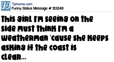 X says this girl I'm seeing on the side must think I'm a weatherman 'cause she keeps asking if the coast is clear...