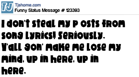 X says I don't steal my p osts from song lyrics! Seriously. Y'all gon' make me lose my mind, up in here, up in here.
