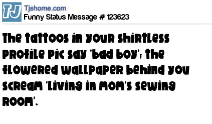 X says The tattoos in your shirtless profile pic say 'bad boy'; the flowered wallpaper behind you scream 'living in mom's sewing room'.