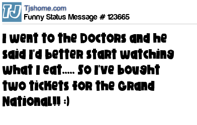 X is I went to the Doctors and he said I'd better start watching what I eat..... So I've bought two tickets for the Grand National!! :)