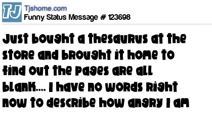 - # 172268 Just bought a thesaurus at Goodwill, I got home to discover all the pages are blank, I have no words to describe how angry I am...