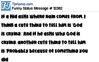 - # 4921 If a kid asks where rain comes from, I think a cute thing to tell him is "God is crying." And if he asks why God is crying, another cute thing to tell him is "Probably because of something you did."
