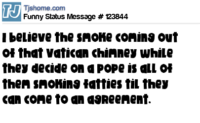X I believe the smoke coming out of that Vatican chimney while they decide on a pope is all of them smoking fatties til they can come to an agreement.
