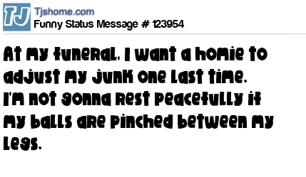 X says At my funeral, I want a homie to adjust my junk one last time. I'm not gonna rest peacefully if my balls are pinched between my legs.