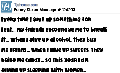X says Every time I give up something for Lent... my friends encourage me to break it... When I give up alcohol, they buy me drinks... when I give up sweets, they bring me candy... so this year I am giving up sleeping with women...