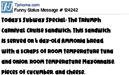 X Today's Subway Special: The Triumph Carnival Cruise sandwich, This sandwich is served on 4 day-old Ammonia bread, with a scraps of room temperature tuna and onion, room temperature Mayonnaise, pieces of cucumber, and cheese.