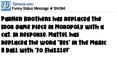 X is Parker Brothers has replaced the Iron game piece in Monopoly with a cat. In response, Mattel has replaced the word "Yes" in the Magic 8 Ball with "Fo Shizzle!"
