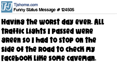 X says Having the worst day ever. All traffic lights I passed were green so I had to stop on the side of the road to check my Facebook like some caveman.