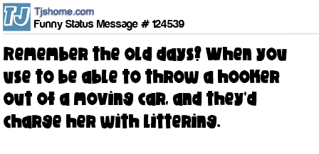 X says Remember the old days? When you use to be able to throw a hooker out of a moving car, and they'd charge her with littering.