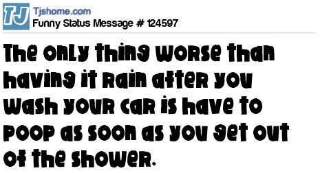 - # 164313 The only thing worse than it raining after you wash your car is having to poop as soon as you get out of the shower.
