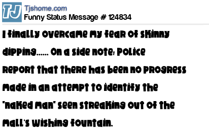 X I finally overcame my fear of skinny dipping...... On a side note; Police report that there has been no progress made in an attempt to identify the "naked man" seen streaking out of the mall's wishing fountain.
