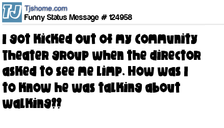 - # 173405 I got kicked out of my Community Theater group when the director asked to see me Limp. How was I to know he was talking about walking?